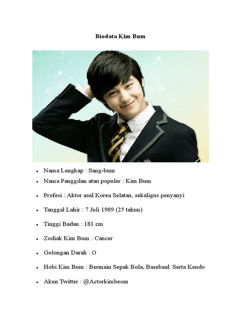 Langsung saja berikut biodata Kim Bum selengkapnya. Biodata dan Fakta Kim Hyun Joong. Dalam blog yang sangat sederhana ini anda para pembaca akan di hadapkan ke berbagai informasi menarik seputar biodata dari para selebritis yang anda idolakan yang dimana meliputi dari artis dalam negeri hingga dengan para.