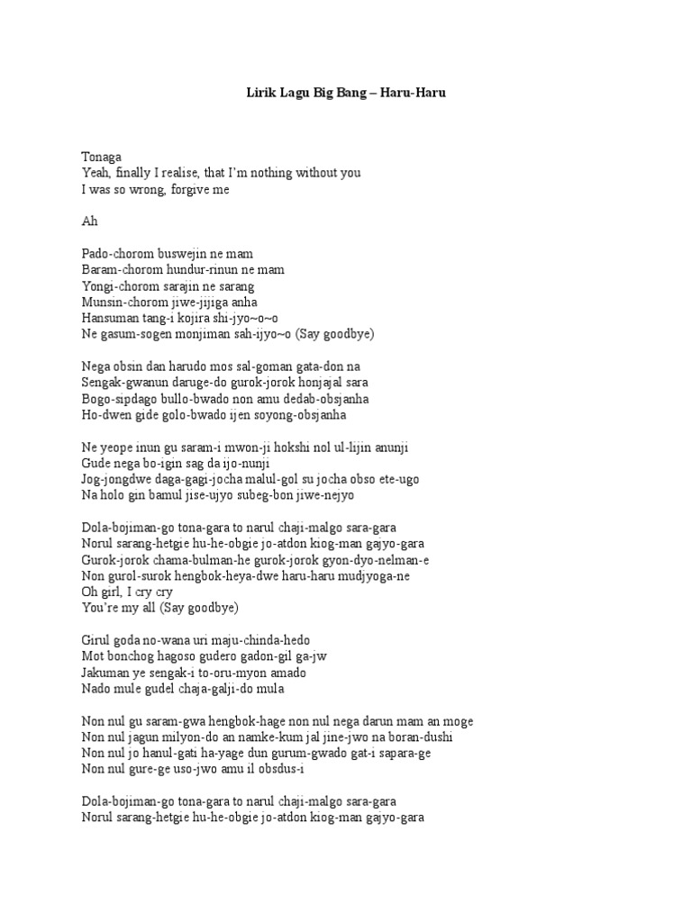 English French German Greek Italian Lithuanian Romanian Russian 1 2 Transliteration Turkish 1 2 English translation English. Lirik Lagu Haru Haru - Big Bang Yeah Finally I realized That Im nothing without you I was so wrong Forgive me Ah ah ah ah - Padocheoreom buswojin nae mam Baramcheoreom heundeullineun nae mam Yeongicheoreom sarajin nae sarang Munsincheoreom jiwojijiga anha Hansumman ttangi kkeojira swijyo Nae gaseumsogen meonjiman ssahijyo say goodbye. Read about music throughout history Read.